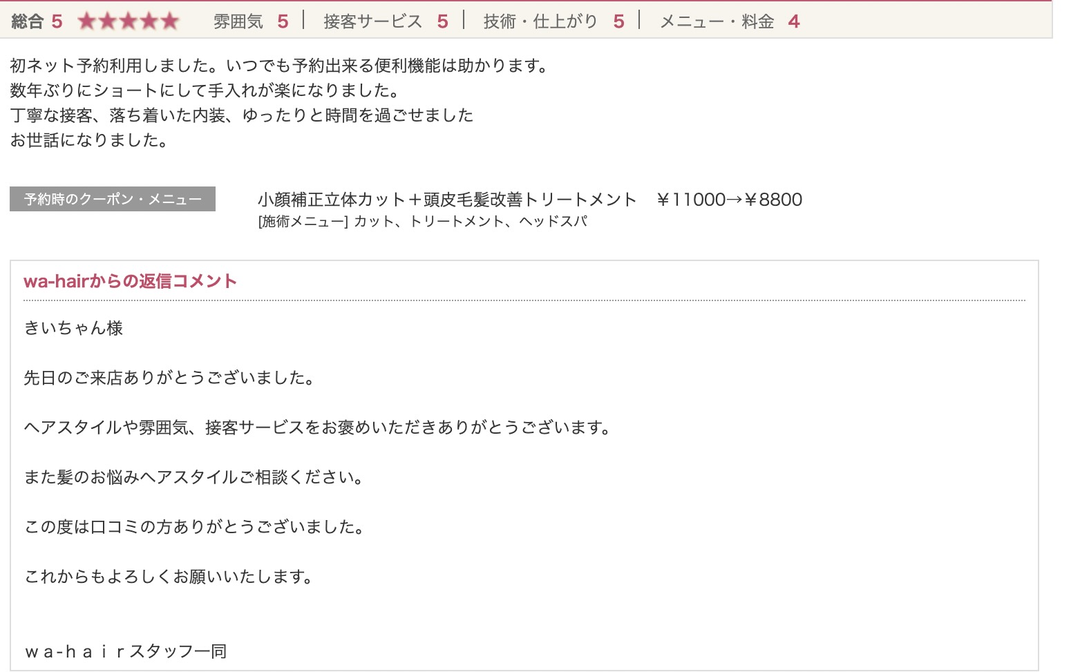 ヘアスタイルや雰囲気、接客サービスをお褒めいただきありがとうございます。