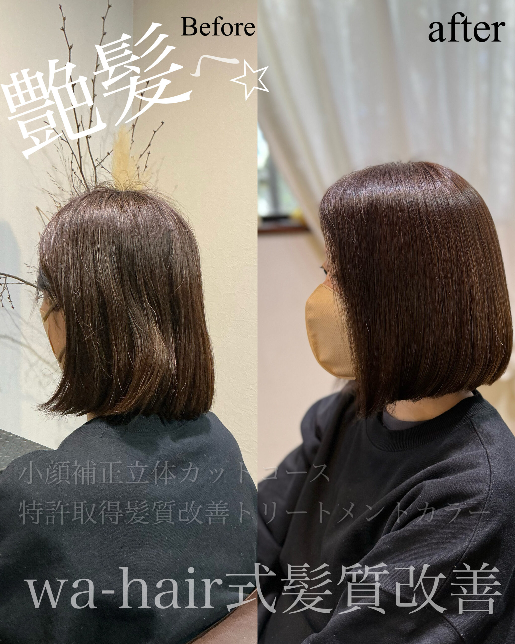 小顔補正立体カットコース&特許取得髪質改善トリートメントカラーで施術しています。