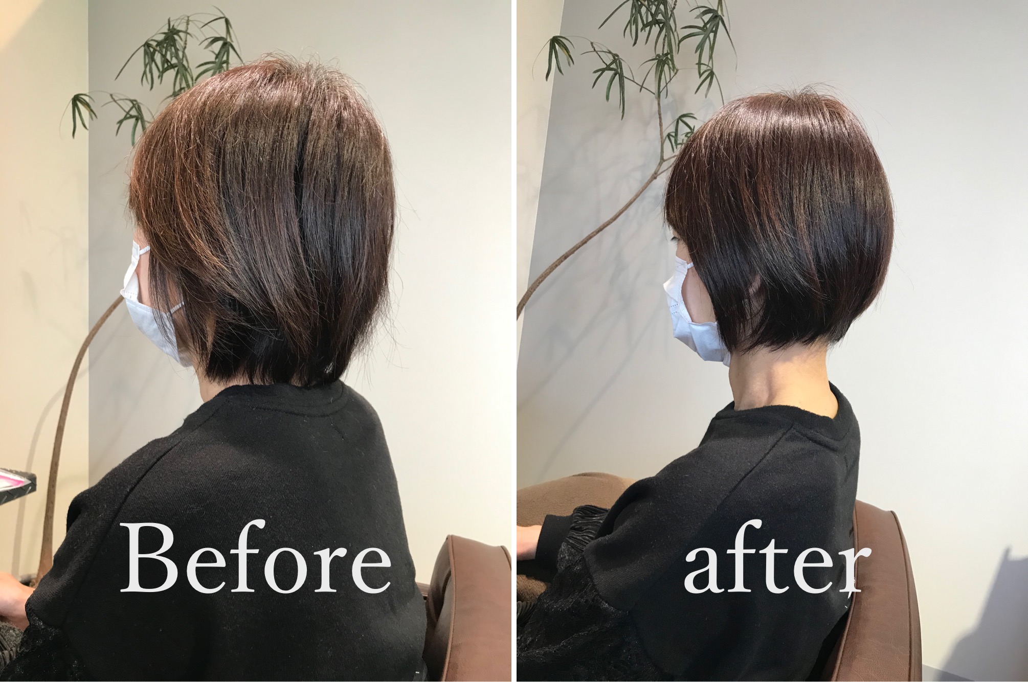 しっかりと丁寧なカウンセリングを させていただいた結果 伸びてきて収まりが悪い 髪に艶が欲しい 白髪をカバーしたい 実際させていただいた施術は 小顔補正立体カット+トリートメントカラーコース。 しっかりと頭皮毛髪改善トリートメントで素髪に戻してあげてから 髪に栄養を入れてあげてカットで 骨格を補正しておさまりよく朝のスタイリングを簡単に ツヤのある髪にしてあげます。