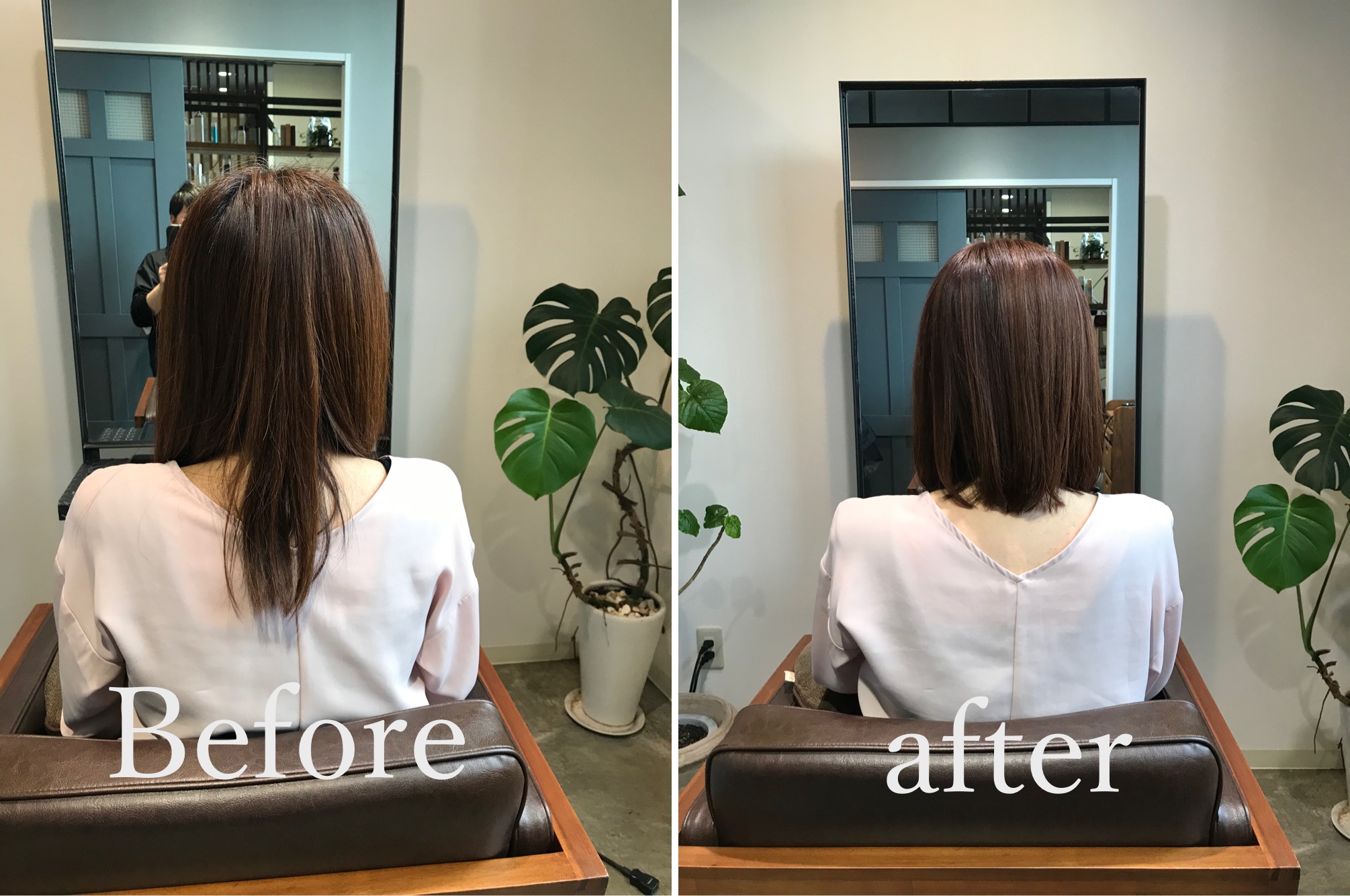 しっかりと丁寧なカウンセリングを させていただいた結果 朝のお手入れを簡単にしたい。 髪の毛の痛みが気になる。 サッパリしたい 実際させていただいた施術は 小顔補正立体カット+トリートメしっかりントカラーコース。 しっかりと頭皮毛髪改善トリートメントで素髪に戻してあげてから 髪に栄養を入れてあげてカットで 骨格を補正しておさまりよく ツヤのある髪にしてあげます。