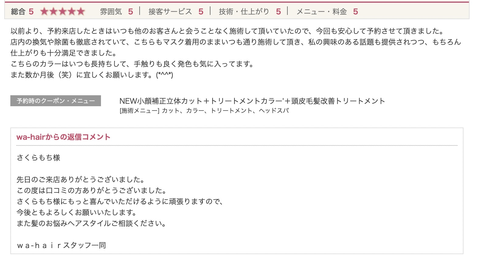 いつも他のお客さんと会うことなく施術して頂いていたので、