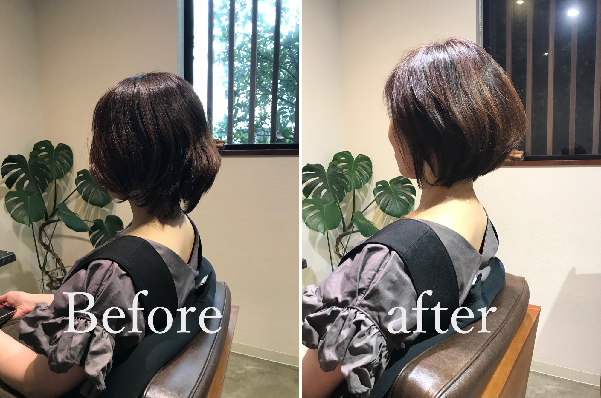 しっかりと丁寧なカウンセリングを させていただいた結果 朝のお手入れを簡単にしたい。 お仕事中に顔まわりがうねってしまう 実際させていただいた施術は ポイント美髪矯正とトリートメントカラー 素髪に戻してあげてから 髪に栄養を入れてあげてカットで 骨格を補正しておさまりよく ツヤのある髪にしてあげます。