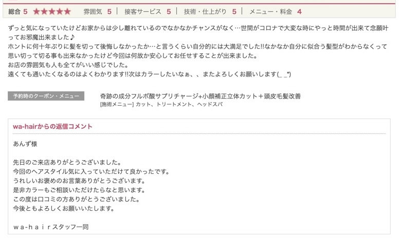 遠くても通いたくなるのはよくわかります!!次はカラーしたいなぁ、、またよろしくお願いします(_ _*)