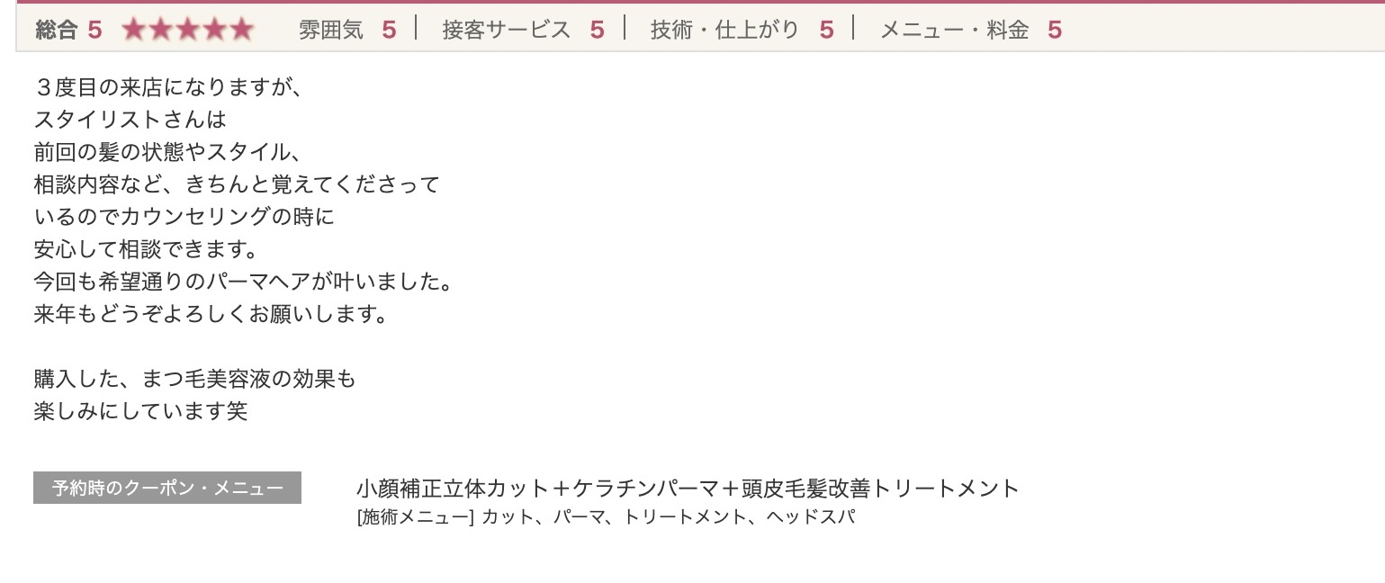 3度目の来店になりますが、 スタイリストさんは 前回の髪の状態やスタイル、 相談内容など、きちんと覚えてくださって いるのでカウンセリングの時に 安心して相談できます。 今回も希望通りのパーマヘアが叶いました。 来年もどうぞよろしくお願いします。