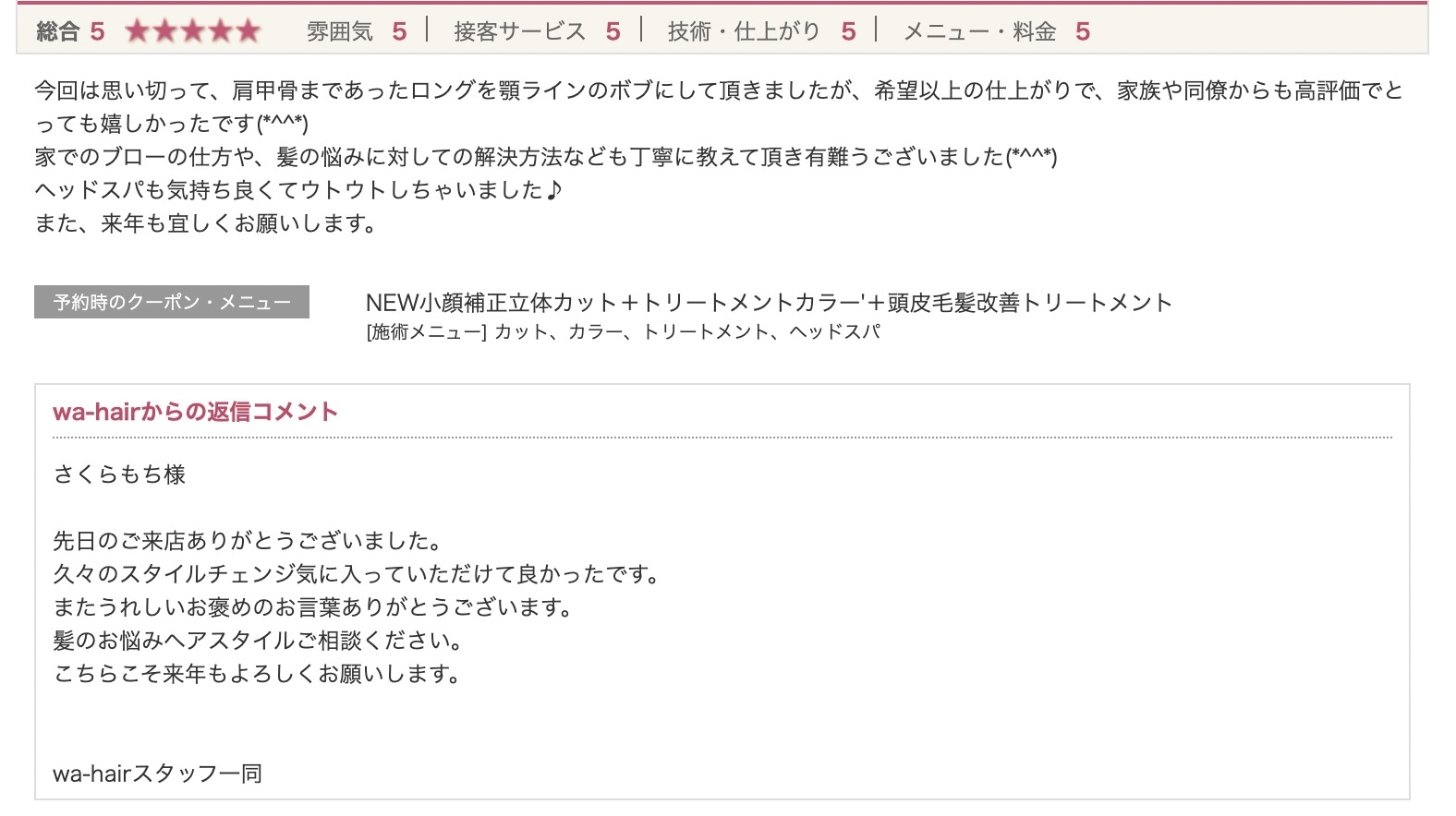 家でのブローの仕方や、髪の悩みに対しての解決方法なども丁寧に教えて頂き有難うございました(*^^*)