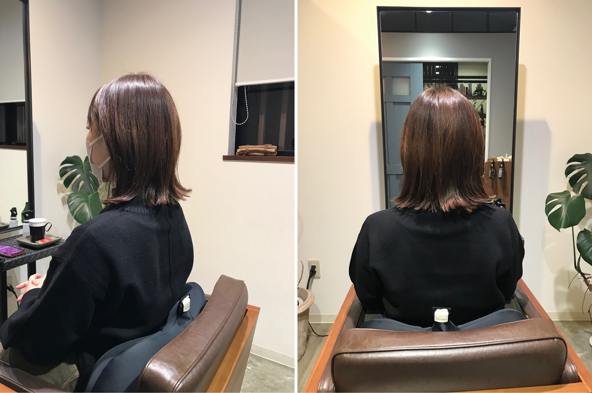 しっかりと丁寧なカウンセリングを させていただいた結果 朝のお手入れを簡単にしたい。 おさまりをよくしたい 実際させていただいた施術は 小顔補正立体カットコース+トリートメントカラー。 しっかりと頭皮毛髪改善トリートメントで 素髪に戻してあげてから 髪に栄養を入れてあげてカットで 骨格を補正しておさまりよく ツヤのある髪にしてあげます。