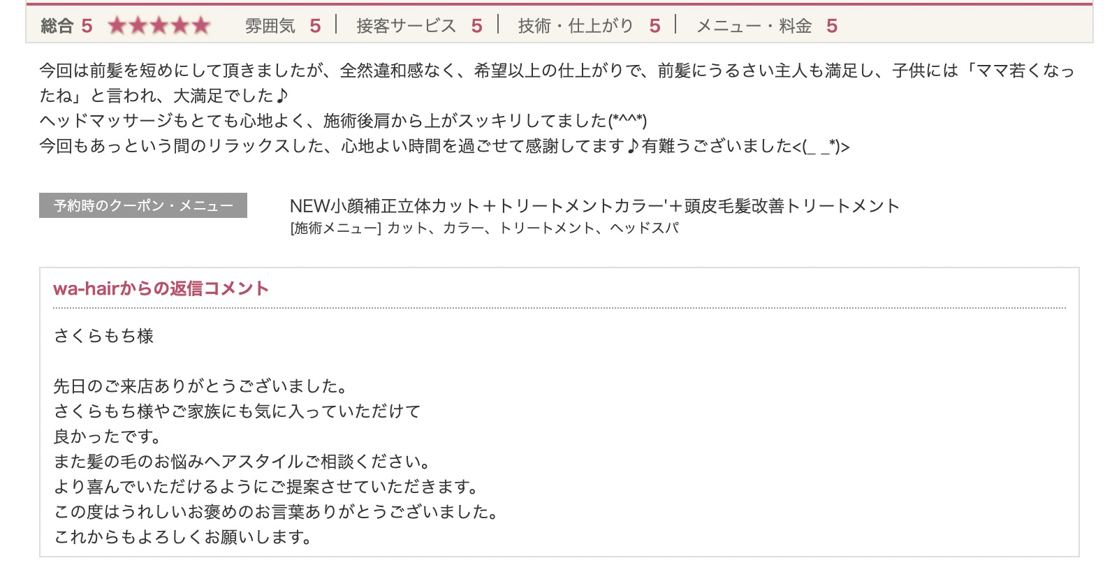 前髪にうるさい主人も満足し、子供には「ママ若くなったね」と言われ、大満足でした♪